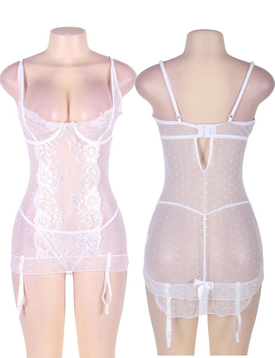 ポルカドット シアーレースのガーター付きスリップドレス(ロングスリーインワン)