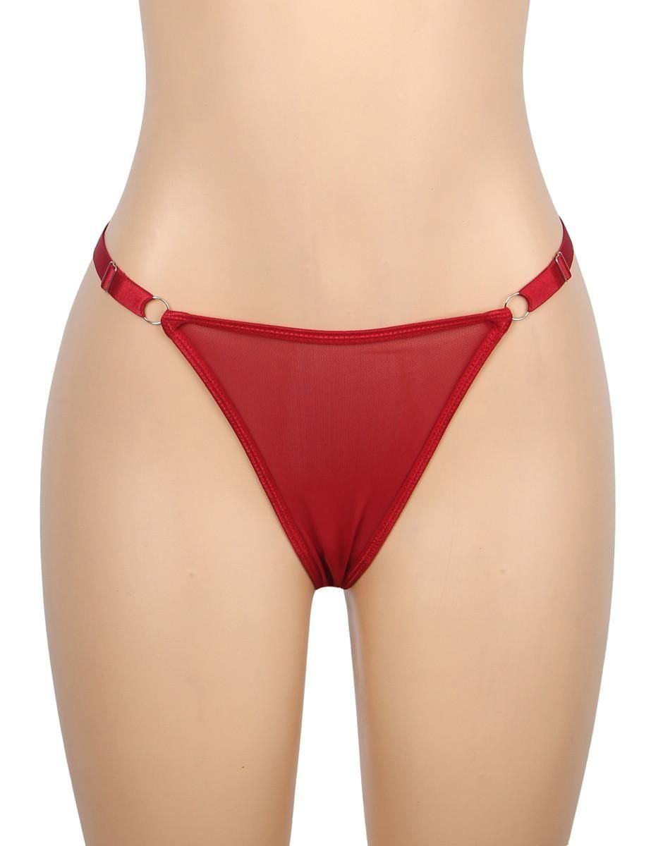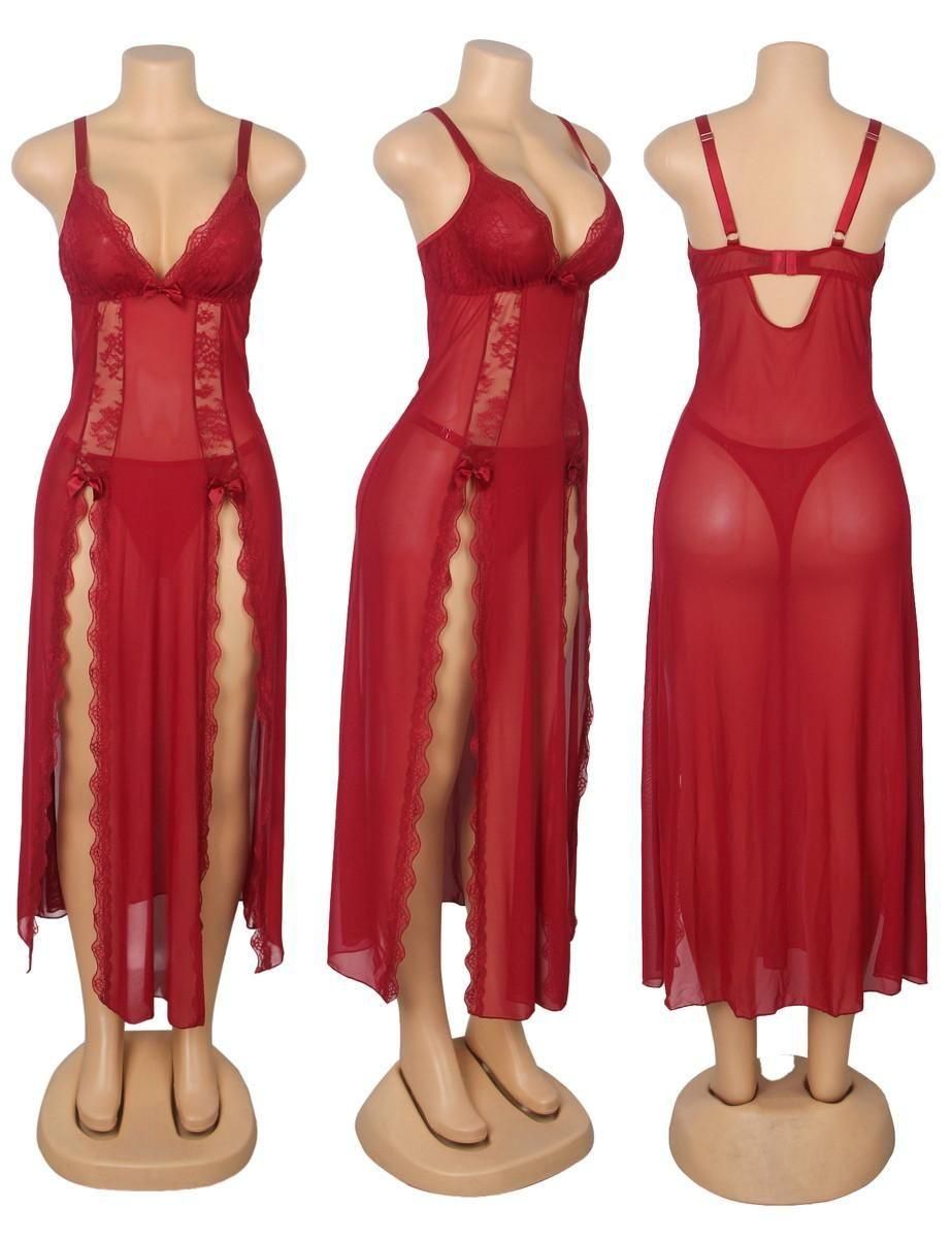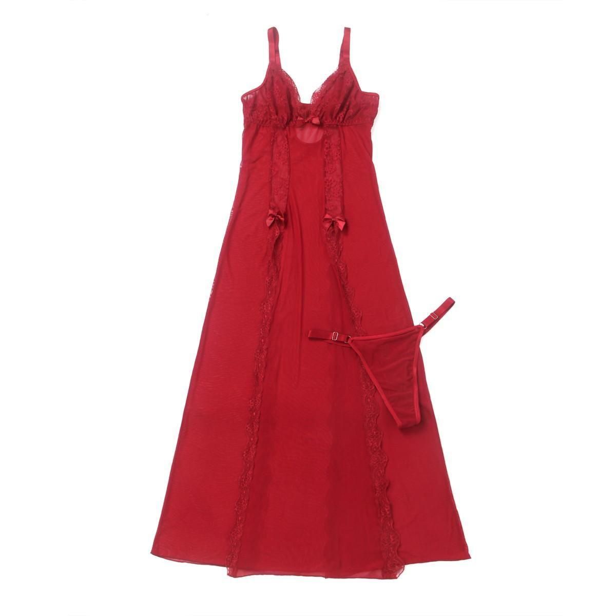 OY82062赤 Mサイズ メッシュ×レース ロング スリットナイティ&Tバック【ロングベビードール】【スリップドレス】【プチプラ】【セクシーランジェリー】